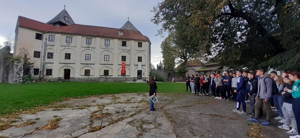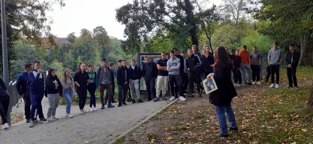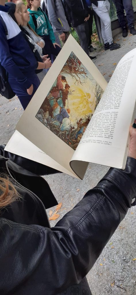 Susret s poznatom ogulinskom pripovjedačicom Sabinom Gvozdić organizirale su profesorica Maja Mamula Salijević i knjižničarka Iva Brajdić. Obišli smo tri lokacije – Frankopanski kaštel, Park izviđača i crkvu sv.Križa, a imali smo priliku prelistati i rijetki primjerak Ivaninih Priča iz davnina ilustriran rukom cijenjenog hrvatskog slikara i grafičara Vladimira Kirina kojem će baš sutra, 5.listopada, biti godišnjica smrti.